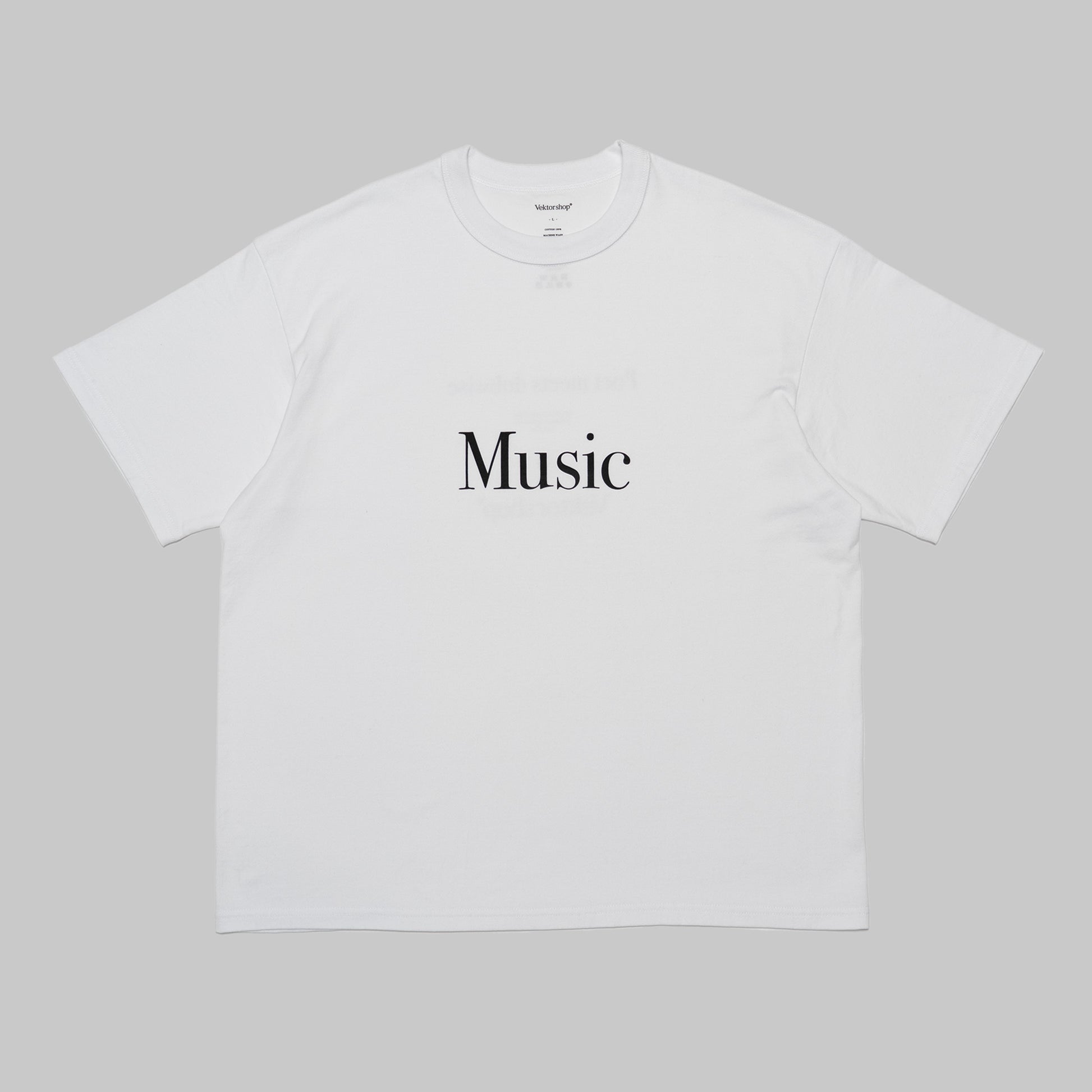 Vektor shop® オリジナルのブランクTシャツをベースに、「Music」のタイポグラフィをプリントした下田氏がVektor shop®︎をイメージしたデザインをプリント。